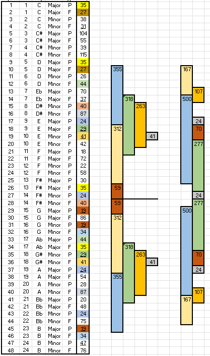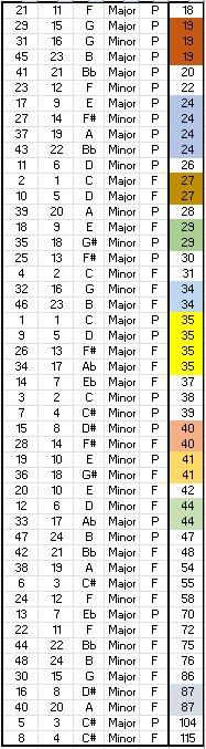 Since the “rounding” operation for the irrational ratios is offensive to some, we can look at only the set of simple “harmonic” ratios of 1:2, 1:3, and 2:3, which can occur exactly, as in the example above. There are 31 instances across all three ratios in the WTC1, so about .5%. At random, there are .11%, and in the shuffled set, .15%. Notably, in the shuffled set, only 14% of the runs had results across all three ratios. One notes though that this subset probably is influenced by the repeated MQ patterns previously observed (for their compositeness), but, as before, that’s begging the question.